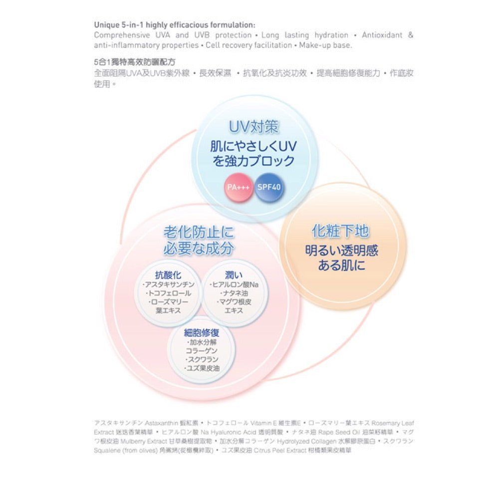 全方位阻隔UVA及UVB紫外線,並有效保護皮膚細胞免受環境污染,游離基等傷害,延緩皮膚衰老症狀。含高效抗衰老成份,提供長效保濕,幫助減淡色斑,幼紋及皺紋,令肌膚更明亮,細滑和緊緻。